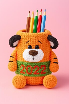 Crochet this playful Tiger Pencil Holder – a functional and decorative tiger-themed container with legs, a tail, ears, a round nose, and signature black stripes. This adorable desk organizer is perfect for holding pencils, hooks, or small tools.