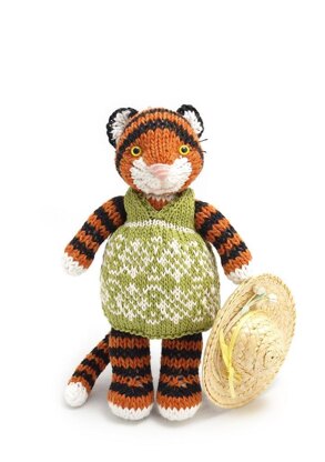 A little tiger girl with a pretty summer dress. Knitting skills required include stockinette and garter stitch, left and right decreases, increase between stitches, changing yarn colours, working flat and in the round, intarsia and colourwork. The dress fits on my other 8-9" toys.