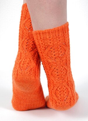 The lace patterns are based on rib stitch, which makes for foot-hugging socks with a comfortable fit on a wide range of foot sizes. Although the socks come in one size only (64 stitches), both foot and leg length can be adjusted to your measurements and preferences. Right and left socks are identical and can be worked two at a time.