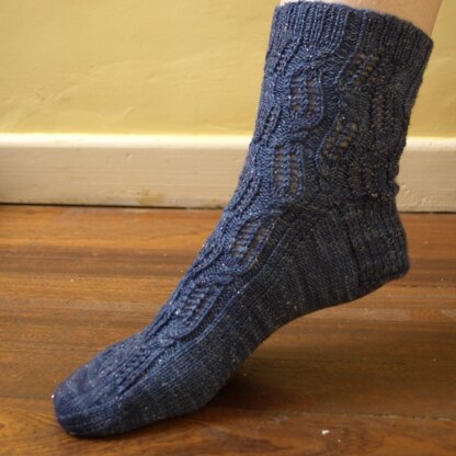 Knitted from the top down, an uneven rib flows into the lace and cable pattern that twists and turns from cuff to toe. Time Warp is a stretchy sock for a comfortable fit with a slip-stitch heel flap.