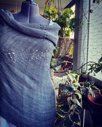Designing this wrap became a journey in itself, and only after a lot of knitting and time passed, it found its form. The time, the timing, finally became right for it. This oval shape will show most yarns favorably, the little lace detail will take it one step further and at the same time make the knitting interesting. Mostly stockinette stitch knitted in the round, increases are hidden in the lace stitch at both ends of the oval, and a finishing garter stitch border knitted back and forth. Simple, but stylish. Easy, but effective and entertaining to knit.