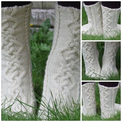Tine Mór are warm, cozy cabled socks knit from the top down with a heel flap. The cables run from the top of the cuff all the way to the end of toes, if you prefer a plain toe instructions are included for those too.