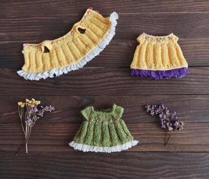 Tiny dress with embroidery KNITTING PATTERN can fit for different dolls and toys: Holala, Pipita, Waldorf, Tilda and textile dolls, teddies, amigurumi, stuffed toys etc. Just use apropriate needle size and yarn. Mini doll dress pattern includes 9 pages and 26 photoes + 3 video supports. The pattern is written in detail but you must be familiar with basic knit stitches and techniques such as: cast on/cast off; how to make knit and purl stitches; worked 'back and forth' on 2 knitting needles. Video support has: - how to decorate the dress with embroidery; - how to shape the hem of the dress using gathering technique, which can be a great alternative to lace; - how to make loops for the buttons.