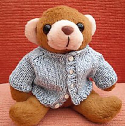 I have designed this easy to knit pattern to fit a tiny teddy bear. The outfit is shown on a teddy of about 12cm (4½ inches) tall when standing, with a chest size of about 11cm (4 inches). As the knitting can be stretched quite easily, the measurements are flexible and the cardigan will fit teddies smaller or larger than this.