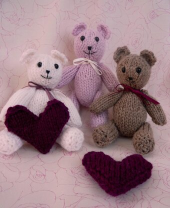 TINY TED complete with heart Ted stands about 5ins tall and has jointed limbs a lovely Valentine or Anniversary gift. 7 page pattern with detailed instructions and photos knitted on the round with dpns, ears are knitted flat with two needles heart also knitted flat suggestions for type of yarn in the pattern, but any dk/8 ply yarn can be used