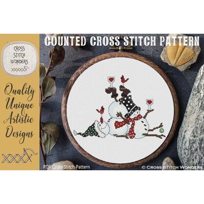 Adorable TIPSY SNOWMAN with their beer or wine!\n\nBoth patterns included.\n\nMarcia Manning designed this from license artwork by ART MATTERS DESIGNS.\n\nEach design is 110 stitches wide by 76 stitches high and use 10 colors.\nSize 11 count: 10.00 x 6.91 inches or 25.40 x 17.55 cm\nSize 14 count: 7.86 x 5.43 inches or 19.96 x 13.79 cm\nSize 16 count: 6.88 x 4.75 inches or 17.46 x 12.06 cm\nSize 18 count: 6.11 x 4.22 inches or 15.52 x 10.72 cm
