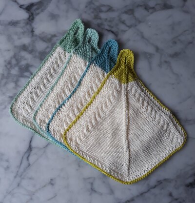The Tirim Tiny Towel is knit in a sport weight cotton yarn, and forms a diamond shape with a hanging loop. The towel features a little cable along the sides, which is nice and easy to work, and would be suitable as a first cable project. The towel measures 10 inches/25.5 cm across at the widest point, and 12 inches/30 cm at the tallest point.