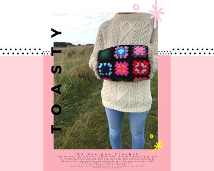 Toasty is made by joining a granny square panel in the round to form a cylinder. The cylinder is then lined with fluffy yarn before adding a faux fur to the trim to finish. It is a super simple and quick design. You can choose to add a handle so as to wear your hand cosy around your neck.