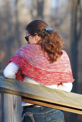 This shawl is knitted top down using a garter stitch tab. The main body is striped using the two colors, which leads into a single color for the lace before a simple crochet bind off.