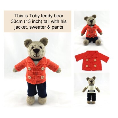 This is Toby teddy bear knitting pattern. He is around 33cm (13 inch) tall and he comes complete with the knitting patten for his jacket, sweater and pants. He's a lovely bear and would make someone very happy to have him.