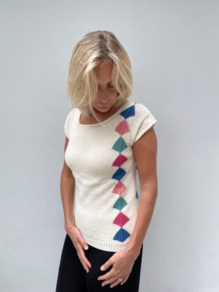 Here’s the simple-to-wear summer top you’ve been waiting for…a classic shape with fun pops of colour. Toga Tassels uses shaped intarsia to create blocks that stack up the side of the top.