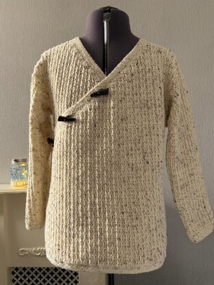 This crochet pattern is for a men's cardigan, with a textured design and overlapping front pieces that join on the diagonal. The cardigan is designed to be joined by large statement piece toggles, but there is also an internal button to keep everything in place. The textured finish is achieved with front and back post crochet stitches. The continuous border is in Linen stitch. The pattern was designed using DK acrylic, specifically Patons Fab DK. The pictures show the cardigan made in Natural Tweed (02070). The garment is made in five pieces and then sewn together. You will be purchasing five versions of the pattern, one for each size, in one pdf file. The instructions include lots of detail to ensure shaping is made easy.