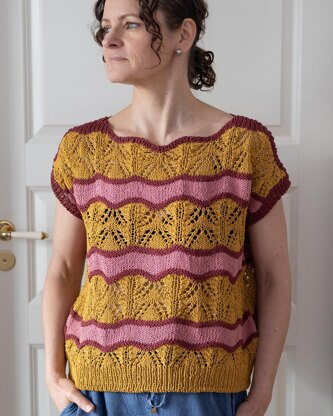 The Toivo Tee is a slightly oversized summer sweater designed to be knitted from yarn made of recycled cotton. The design features the use of three colors, but the sweater could just as easily be knitted with one, two, or multiple colors. Feel free to experiment by making each stripe a different color. The oversized fit makes it a breathable and comfortable summer knit.