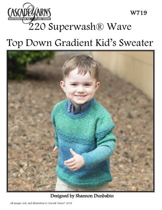 Top Down Gradient Kid's Sweater in Cascade 220 Superwash Wave - W719 - Downloadable PDF est un modèle de Tricot Intermédiaire gratuit par Shannon Dunbabin, disponible au format PDF téléchargeable et comprend des instructions en Anglais. Super amusant à réaliser, ce modèle pourrait être votre prochaine œuvre d'art !