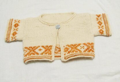 4/30/09 This is a matching bolero for baby dress Topaz on Knitty spring 09. This short cardi is fairly quick and easy with seamless construction, drop shoulders, and simple color works.