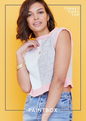 We know this will fast become your favourite top of the summer! Cute, sassy and cool to wear, Torrey Pines is quick to knit and colour blocked in Paintbox Yarns Cotton DK and Paintbox Yarns Metallic DK for a little bit of sparkle, with contrast hem, neckline and cuffs.