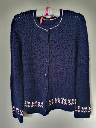 This is a close-fitting crochet cardigan featuring small flower motifs and worked in alternating stitch which produces a fabric with a textured appearance.