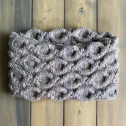 This bulky weight ‘Eclipse Cowl’ uses a combination of different sized, right and left leaning cable crosses. The cable stitches come together to form a circular design that I think resembles an eclipse. The cowl is knit in the round and creates a long tube. You will seam both the cast on and bind off edges together at the end. As a result, you end up with a double-layered fabric that is extra squishy and cozy.