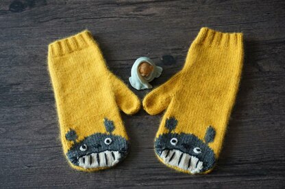 This mitten is worked flat. It requires intarsia colorwork technique. The eyes are worked separately.