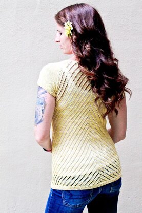 Touch the Sky is a delightful, light weight, lacy, open, and very feminine cardigan. This cardigan is worked as a top down raglan and is completely seamless. The design features V-lace lace that radiates across the back and fronts; the lace rays it creates is very reminiscent of the bird’s feathers during the flight, thus the name. Let this cardigan enchant you with its simple lace and flowing lines. Let your imagination fly as you see the design unfold.