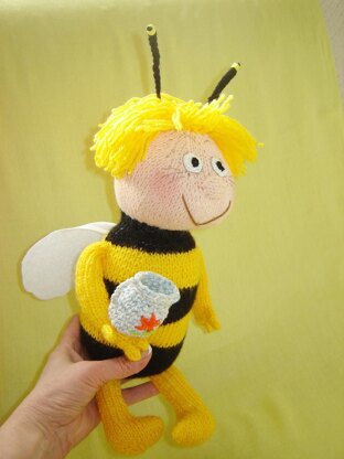 Toy knitting patterns - Knit Maya the Bee with a Honey Jug. Cute stuffed toy measures 13 inches tall. This pattern contains all the instructions that you will need to knit the details of the toy and accessory to it. Their assembly is shown in step-by-step photographs. To create a toy you will need knitting needles, yarn, a crochet hook, mustache wire, and toy filler.