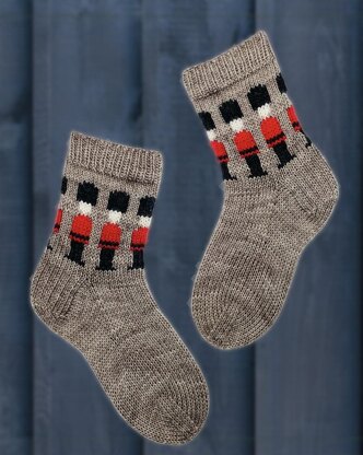 With classic colors and a simple engaging chart, the cuff-down Toy Soldiers Christmas socks are a simple pattern for sock knitters to make as Christmas gifts.