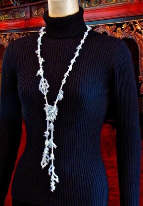 The original yarn used (purple silk with amethysts), which inspired the design, has since been discontinued. I expected to publish this design long ago because it's a simple concept. However, some of the fancy stitches needed step by step photos, and I discovered new styling options as I wore new Lariats made with different yarns. After wearing and testing these Lariats, I created a section of tips and guidelines called "Lab Notes." For those who wish to recreate the necklaces pictures as closely as possible, those details are included also.