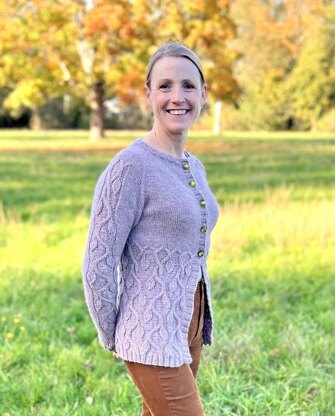 This is a soft, comfy cardigan with an original cable that is easy and fun to knit. It is top-down, circular yoke with a mock-raglan sleeve. The cable set into the sleeves is reminiscent of stained glass. The whole thing is eye catching and flattering