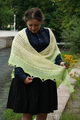 The shawl is built from the top middle point and grows along the edges and the spine, with a geometric increase in an easy to remember stitch pattern.