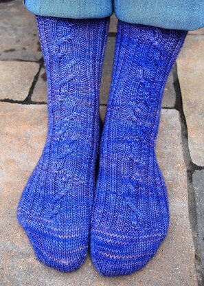 These socks feature sinuous mirrored cables running down the front, and ribbing around for a snug, stay-up fit. These cables are intricate enough for accomplished knitters, and easy enough for adventurous beginners or those new to cabling.