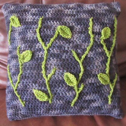 Show off your stitching prowess with the Traveling Vines pillow. Intarsia post stitch vines are decorated with leaves sewn on after. The pillow is designed as a removable case for a pillow form- making cleaning and care a breeze. Inspired by leaf designs often seen on pie crusts, the bold Malabrigo colors give it a decidedly modern look.