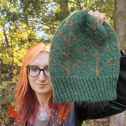 This hat is knitted bottom-up, in the round, starting with half-twisted ribbing, decorated with simple colorwork in the body. The crown decreases gradually in sections, and is gathered at the peak.