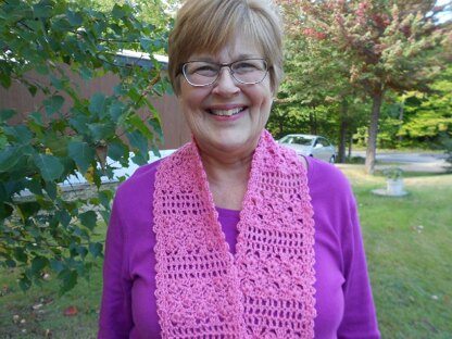 Yarn: 285—300 yards (261—274m) fingering weight. Samples were made with: Pink loop--2 balls Herrschners 2-ply afghan yarn, 100% Acrylic in color Guava; 2 oz/56g/220 yd/201m per ball. Blue scarf—2 balls Bernat Baby, 90% Acrylic and 10% Nylon in color—Baby Blue; 1.75 oz/50g 191 yards/175m per ball.