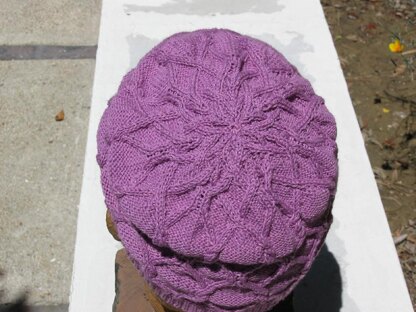This hat has a continuous cable pattern around the sides that ends with a star pattern on the crown. The hat is worked using circular and double-point needles.