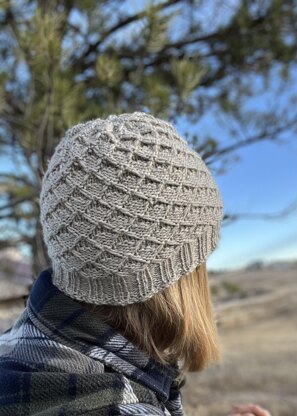 The Trellis Stitch Beanie is so much fun to work up! Each row of the trellis stitch pattern is a 6-peg repeat, so it looks a whole lot harder than it really is. The pattern includes two patterns: one where every row is written out, and one that incorporates the Trellis Stitch chart. You decide which type of pattern to use to knit this eye-catching beanie. The beanie is knit on any 3/8" gauge round loom, like Knitting Board's Flexee skinny loom links or the All N One loom. The adult large hat uses 84 pegs connected to make a circle loom. The adult medium hat uses 78 pegs. The Trellis Stitch Beanie uses approximately 200 yards of a worsted weight yarn and is suitable for a advanced beginner loom knitter who is ready to take on a new challenge. The sample was knit using Perfection by Kraemer Yarn, worsted weight [4], 70% acrylic 30% wool yarn in the Quartz colorway.