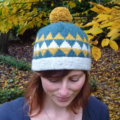 Triangle hat is a simple fair-isle bobble hat knitted in straight needles and seamed at the back.