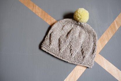 A cute, modern baby bobble hat with a fun geometric triangle pattern topped off with a tiny pompom!