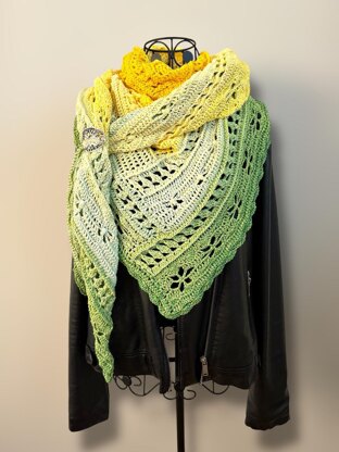 Pattern is available in English and German. The Idyia triangular shawl is part of the popular series of shawls with a twist. It can be crocheted in any size and charms with its many flowers and butterflies.