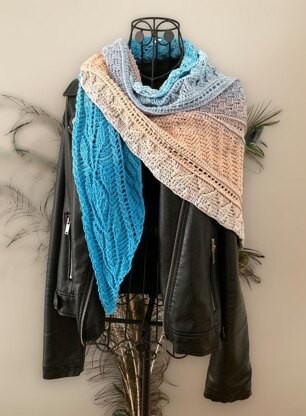 Pantariste is an asymmetrical triangular scarf that is made of loads of front post and back post stitches. The scarf has a beautiful leaf pattern on one side, and different front post/back post patterns on the remaining part of the scarf.