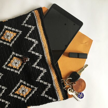 Make this stylish and functional clutch bag featuring a bold tribal geometric pattern and leather flap.