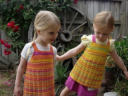 This garment is knit from the bottom up all in one piece. Stitches are cast on at the top of the skirt to knit the back tie straps. The bodice is shaped with decreases, and the cross-over straps knit last. The edging is integrated into the skirt lace pattern. The lace pattern has both chart and written instructions.