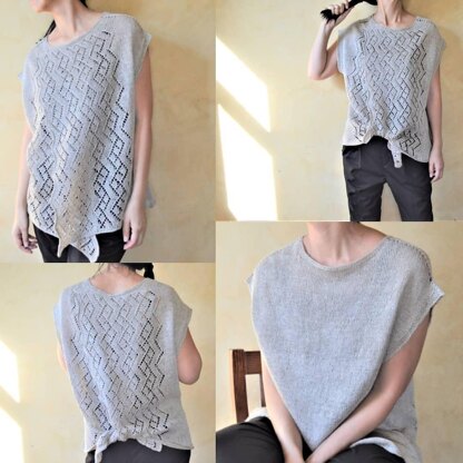 A summer top with a simple stockinette front and broad lacy slits on the back.Tsuzumi is an interchangeable top that you can wear with the opening in the front or back. Plus if you tie the slit edges at the front or tie at the back, you can enjoy different styles in 4 ways.WORK PROCESSTsuzumi is worked from the top down in one piece in the following order.1. Neckband is worked in the round. 2. Yoke is shaped with short rows and making increases at shoulder lines, then back is separated and lace panels are started. 3. Left Back, 4. Front and 5. Right Back are separately worked flat. 6. Sleeves are picked up from armholes continuously with working yarn and finished off sleeve edges without breaking yarn. Backs and front are joined at underarms in the beginning of 7. Lower body. After making waist shaping, 8. Hem is shaped with short rows. Bind off along zigzag edges of back slits, then 9. Finishing.