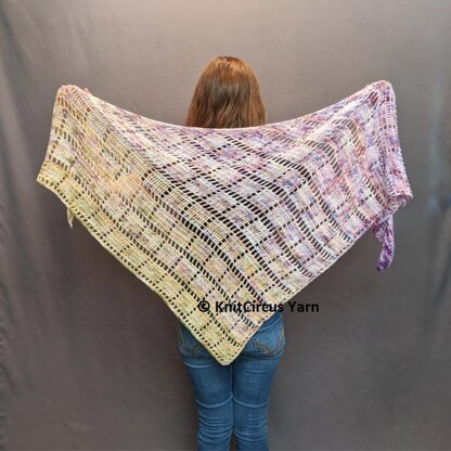 Worked side to side in Tunisian Double Crochet Stitch, the piece starts at a top corner and finishes at the opposite straight edge. KnitCircus’ Impressionist Gradient, coupled with the Tunisian crochet technique, gives a very happy, joyful, and subtle color progression.