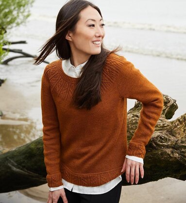 Knitting seamlessly bottom-up in the round, you start Tuntu right away with the interesting textured pattern of the hem that gives the sweater a slight A-line, and work straight up to the underarm. Then, the sleeves are knitted separately and joined with the body. The yoke is shaped with a number of wrap & turn short rows. You then knit the textured pattern of twisted stitch cables and slipped stitch until the neckline ribbing. The transitions from hem to body, as well as from yoke to neckline are worked with double knitting, and give the sweater a very sophisticated finish.