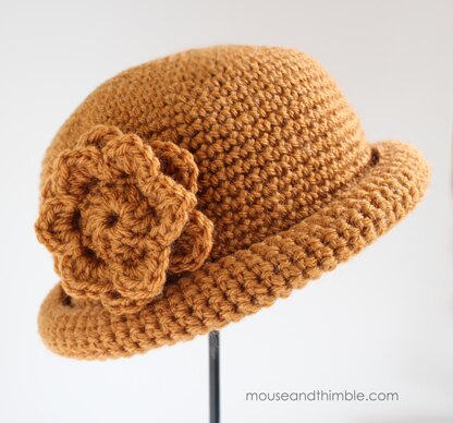 A classic chic cloche & flower hat to fashion with dresses or jeans. Style with a rolled brim, flipped up to one side, or all the way down. Quick and easy to crochet in-the-round. Hat is worked in a continuous spiral without turning or joining; as is the simple flower motif, as well. Separate instructions for each of 5 hat sizes ranging from infant photo prop thru extra-large adult. Flower will measure about 3.5" across. Shown with a shank-style button sewn on to the center (optional). You'll just need 1 skein of Vanna's Choice medium weight yarn for all but the largest hat size, which will call for a tad more yarn from a second skein. Easy to follow format + abbreviation key with descriptions. Stitches: ch, sc, hdc, dc.