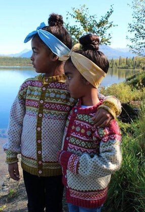 The jackets are worked bottom-up, stranded knitting, steeking at the front for opening and closure, on both sides of the body for sleeve openings, and also altered in the front at the neck line. I chose Intermediat level because of steeking, but it is pretty good described with pictures and text. Rauma Finull yarn is a great wool yarn for this project. I am not sure if all the yarn colors are still available, but I am sure of that there are great supplements. Also, PT2 is now called Rauma Finull PT2. My grand daughters lived in Alaska when the pictures were taken, and the jackets were perfect for a cold climate. I hope you will enjoy the pattern!