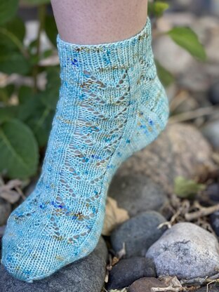 I love shortie socks in the spring and summer and when I saw this yarn, I knew it would be perfect for a streamy lace flowing down the foot.