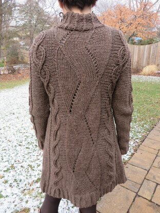 This long cardigan can also be worn as a short dress. It knits up quickly with bulky yarn and is so versatile. If you don't like to weave in yarn ends this yarn is for you. You can knit the entire back on 1 strand.