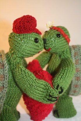 Turtsie and Tartsie are in love! From the first time Turtsie set his little beady eyes on Tartsie he knew that she had to be his! This pair of turtles can be knit separately or as one unit. Each takes about 90m of the main yarn and another 45-50m of accessory yarn. It is an easy pattern but does have intarsia for the turtle shell so it is termed intermediate. Otherwise it is EASY. You can use any DK yarn for the body and shell and then eyelash or boucle for the heart. Suitable as a toy or ornament. The heart is attached to the hands with snap fasteners. Full instructions are given for all the elements: turtles,heart,hat, headband and assembly of all.