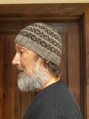 **MATERIALS:**sport weight yarn in 2 colors with good contrast (17-51g/60yds-130yds MC & 6-28g/ 22-72yds CC) Shown above in 12 wpi handspun 2-ply sport weight yarn (size Adult S) Yield: MC: natural grey CVM: 428 yds/6 oz/169g, used 122 yds/1.7 oz/47g CC: natural brown Navajo Churro: 114 yds/2 oz/56g, used 42 yds/0.7 oz/21g Drafting method: Short forward draw, spun woolen for warmth 16-in US 4/ 3.5 mm circular knitting needles set of 4-5 US 4/ 3.5 mm double pointed needles stitch markers darning needle